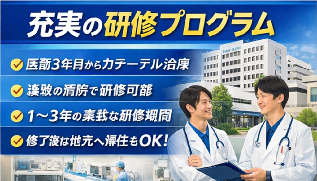 - 医師3年目からカテーテル治療を含む実践的な研修が可能